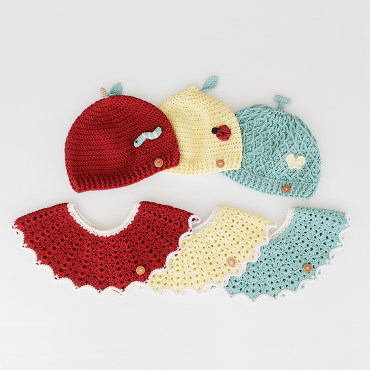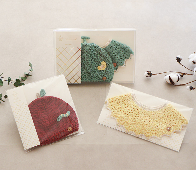 コットン100%のやわらかい素材で肌にやさしいニットキャップとビブは